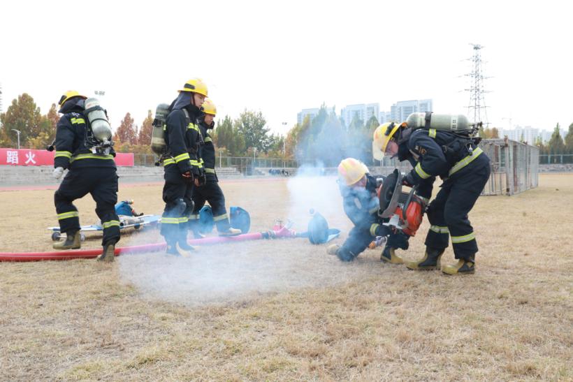仪式结束后,与会人员共同观摩了学校与鹏泉消防救援站联合开展的灭火救援实战演练。演练模拟火情发生后的应急响应、人员疏散、高空救援等环节,过程紧凑有序,展现了学校应急处置机制与消防救援队伍的专业能力,为全体师生上了一堂生动的消防安全教育课。