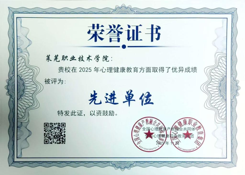 近日,第三届全国心理健康职业教育发展峰会在江苏南通落下帷幕,学校荣获2025年度全国职业院校心理健康教育先进单位,心理案例“融五育之力 攀心育之阶:打造莱职心理健康教育新范式”荣获“全国职业院校心理健康教育优秀案例”,心理健康教育中心教师张娟娟被评为“2025年度全国职业院校心理健康教育优秀教师”荣誉称号。