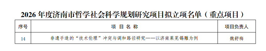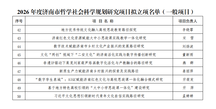 近日,济南市哲学社会科学工作办公室正式公布了2026年度济南市哲学社会科学规划研究项目拟立项名单,学校共有10项课题入选,其中重点项目1项,一般项目9项。