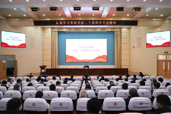 为深入学习宣传贯彻党的二十届四中全会精神,根据市委统一部署及市委工作安排,11月25日上午,市委宣讲团成员,市委教育工委常务副书记,市教育局党组书记、局长王纮到学校作党的二十届四中全会精神专题宣讲报告。学校党委书记徐运国主持宣讲会。市教育局党组成员、副局长王志国及相关负责同志,学校领导班子成员、中层副职以上干部、思政教学部全体教师以及各系部教师代表和学生代表参会。