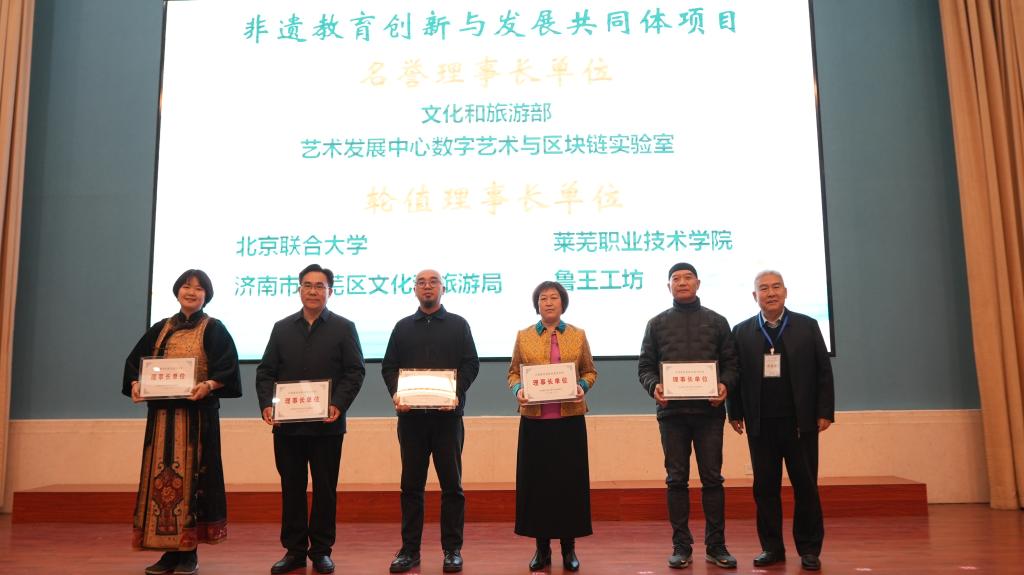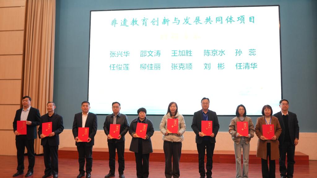 与会领导共同启动“非遗教育创新与发展共同体项目”,并为共同体理事长单位、副理事长单位授牌,为特聘专家颁发聘书。