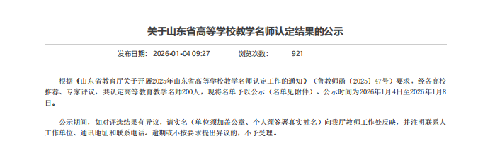 1月4日,山东省教育厅发布《关于山东省高等学校教学名师认定结果的公示》,经高校推荐、专家评审等环节,学校教师孙锋申成功入选2025年“山东省高等学校教学名师”。