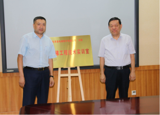 仪式上,王述辉、董海燕共同为“奔速电梯国家中心实验室beat365在线唯一官网分中心”揭牌;李长明、董海燕共同为“山东奔速电梯股份有限公司捐赠电梯工程技术实训室”揭牌。