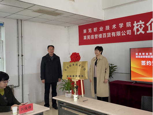 为了进一步加强专业建设,改善学院实践教学条件,提高学生专业知识认知水平,培养学生实践操作能力,11月26日上午,学院与莱芜信誉楼百货有限公司联合举行了实践教学基地建设协议签字暨揭牌仪式。学院党委副书记毕玉海、商务管理系党总支书记(主任)郝金镇及相关部门负责人参加。