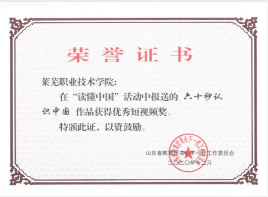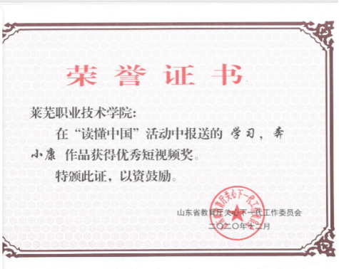 近日,山东省教育厅关心下一代工作委员会发布了关于“读懂中国”活动作品评选情况的通报,学院获组织奖,学院作品《六十秒认识中国》《学习,奔小康》获得优秀短视频奖。