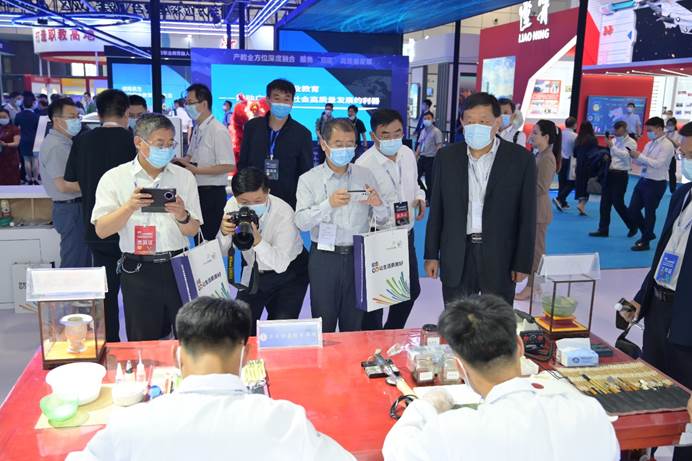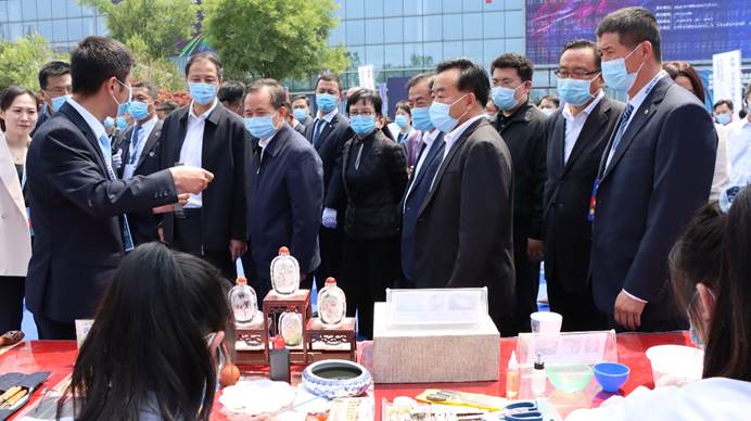 在学院文物修复技能展示现场,山东省委副书记、省长李干杰,教育部党组成员、副部长孙尧等领导听取了学院文物修复与保护专业人才培养情况,驻足仔细观看同学们精湛的陶瓷和青铜器修复技艺。