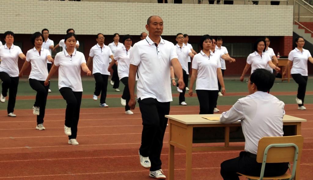 蓝天白云下,绿茵操场上,教师们统一着白色运动装,迈着整齐的步伐入场,形成一道亮丽的风景。展演中,教师们动作标准、有力、优美,让人赏心悦目;比赛中,教师们队伍整齐、口号响亮,认真完成每一个动作,博得了在场师生的阵阵掌声。