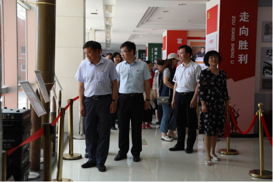 在学院党委书记董海燕、纪委书记李允实陪同下,济南信息工程学校党委书记、校长刘光泉,副校长赵素霞,副校长何东远,党政办公室副主任郭经媛;济南农商银行市中支行党支部书记、行长弭超,支部委员、副行长贾心静等领导一行34人参观了“初心馆”。初心馆里一幅幅图片,一件件实物向大家讲述了共产党人英勇无畏、艰苦奋斗的革命精神,一个个感人事迹让大家深受感动,也让大家进一步了解党史、国史以及国防教育。之后,客人一行还实地参观了在党建主题公园。