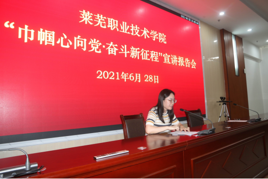 为贯彻落实山东省妇联“巾帼心向党,奋斗新征程”文件精神,引领学院女教师学史增信、学史崇德、学史力行,充分发挥巾帼标兵的辐射带动作用,6月28日下午,学院举行了“巾帼心向党,奋斗新征程”宣讲报告会,工会主席徐静出席报告会。