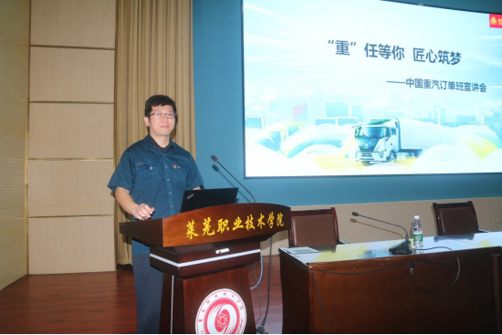 随后中国重汽人力资源部李干山主任进行本次“中国重汽订单班”宣讲,李干山主任介绍了中国重汽的发展历程,着重讲解了“中国重汽订单班”学生教育模式及入职发展机制,并期待同学们加入“中国重汽订单班”。
