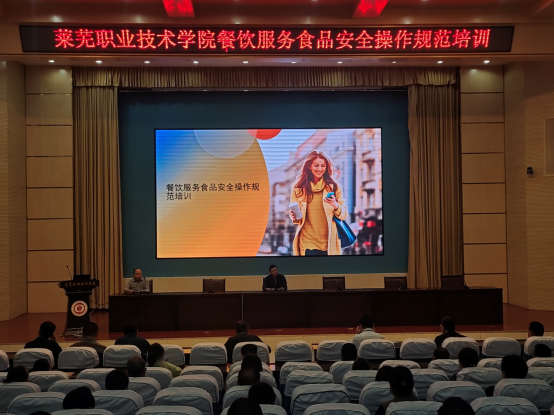 为贯彻落实山东省学校安全工作视频会议精神,依据《中华人民共和国食品安全法》规定要求,结合学院餐饮服务工作实际,9月25日上午,学院邀请上海天祥质量技术服务有限公司食品审核专家王刚来学院作《餐饮服务食品安全操作规范》专题培训讲座。上海天祥质量技术服务有限公司山东分公司食品部经理张金雷、济南市莱芜区市场监管局餐饮科科长董义国、济南市莱芜区市场监管局鹏泉监管所所长张新豪、学院副院长魏广舜等领导出席培训会。会议由总务处处长刘子爱主持,总务处餐饮服务管理人员、学生食堂、超市食品从业人员共计150余人参加了培训。