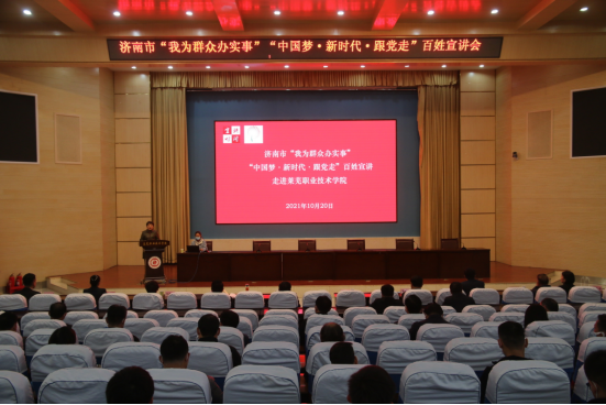 为深入贯彻落实习近平总书记“七一”重要讲话精神,扎实推进党史学习教育“我为群众办实事”活动,10月20日上午,济南市“我为群众办实事”“中国梦·新时代·跟党走”百姓宣讲进基层活动走进学院。市委讲师团副处级干部吕桂红,市委党史学习教育第23巡回指导组刘斌,宣讲团成员市委党校社科与统战教研部讲师陈军、山东盖伊尔智能电器有限公司董事长尚金花、历城区派驻南部山区西营街道叶家坡村“第一书记”李洪文、天桥区医疗保障局职工医保科科长杜鹃、章丘区辛锐中学教师刘希云、市委军民融合办派驻商河县怀仁镇东岭新村党支部书记助理郑祥文,学院党委书记董海燕,党委副书记、院长孔祥敏等领导出席活动。学院副科级以上干部、思政课教师、学生代表,共计300余人认真聆听了宣讲。