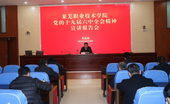 12月24日下午,学院组织宣讲党的十九届六中全会精神。本次宣讲由党委书记董海燕主讲,学院领导班子成员,副科以上干部,各党支部书记,部分学生代表聆听了宣讲。
