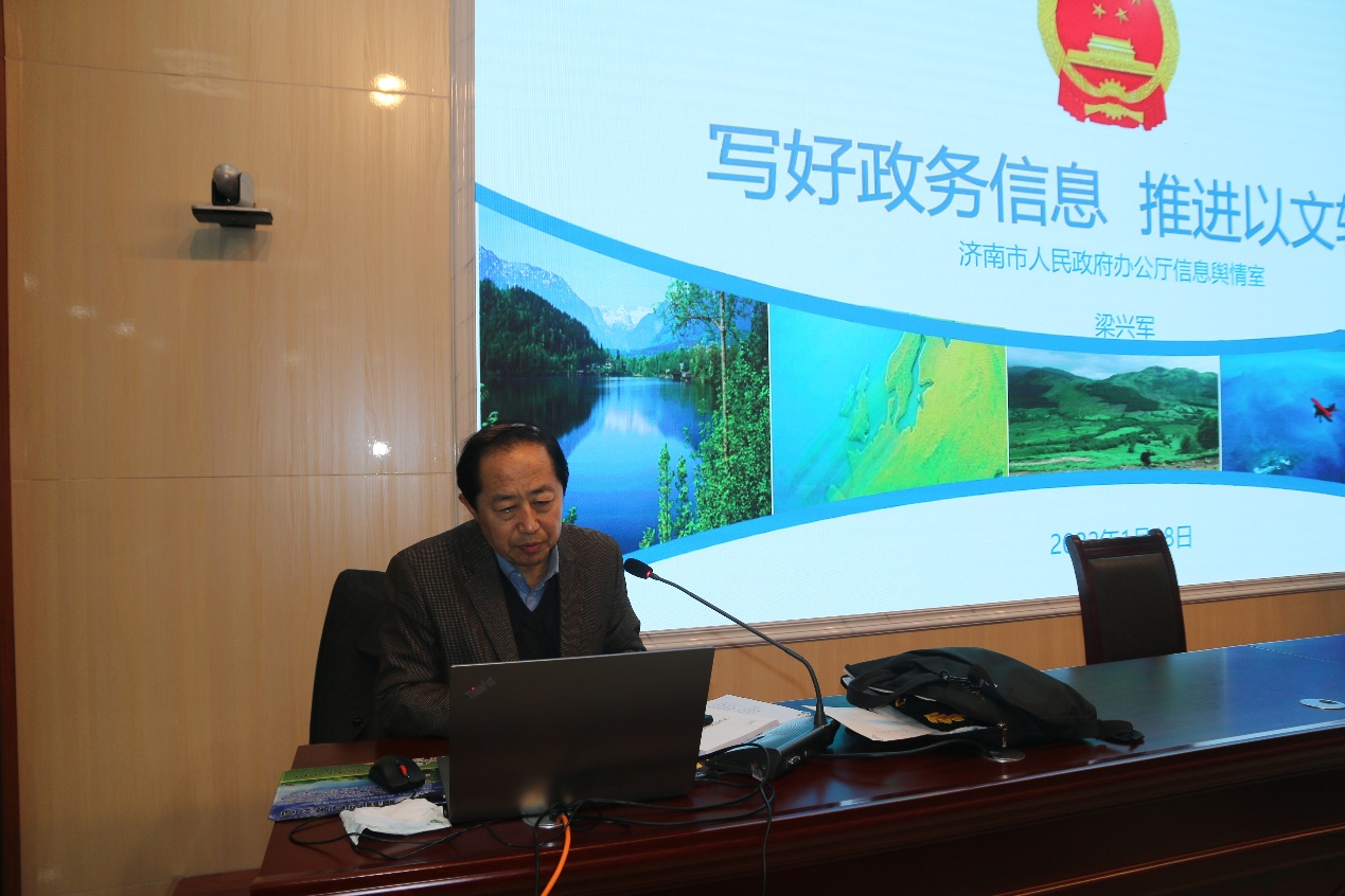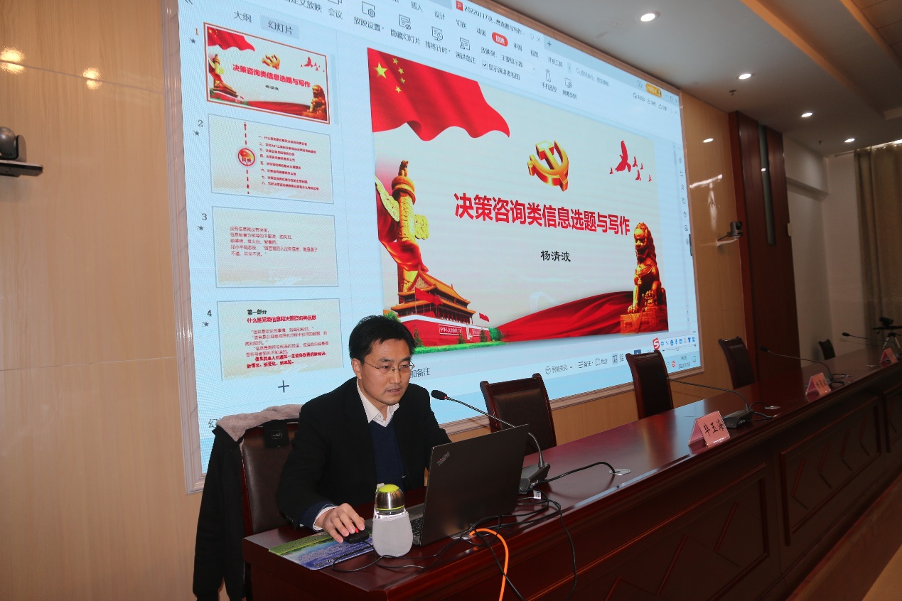 杨清波从决策咨询类信息定义、分类、怎么写等八个方面重点阐述了“决策咨询类信息选题与写作”这一主题;梁兴军从政务信息的地位和作用、选题来源、载体介绍等方面为大家作了《写好政务信息 推进以文辅政》的专题报告。