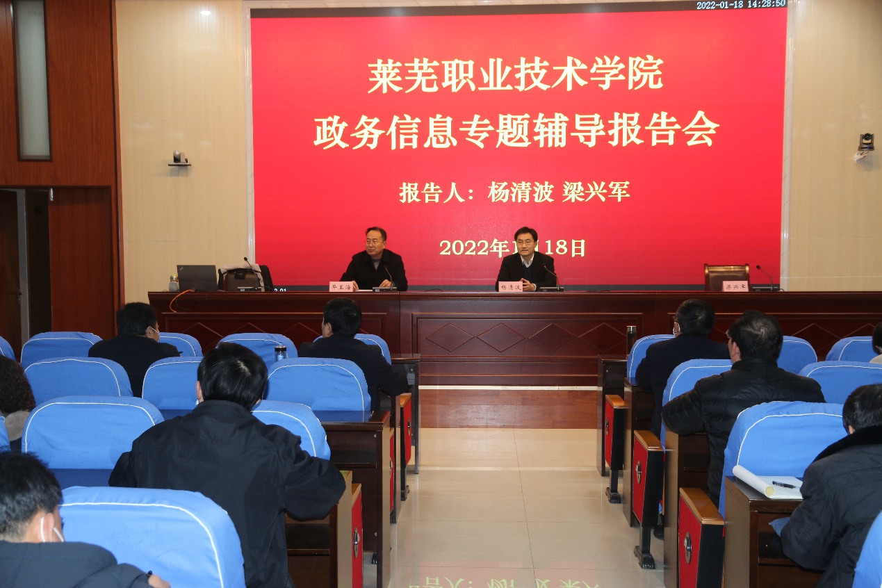 为提高干部职工掌握、收集、撰写、报送信息的能力,促进学院高质量发展,1月18日学院邀请市委办公厅综合二室主任杨清波,市政府办公厅二级调研员梁兴军来学院作专题辅导报告。学院领导,各处室负责人,各系党总支书记、副书记、办公室主任以及各处室、系负责信息撰写报送的人员参加培训。党委副书记毕玉海主持报告会。