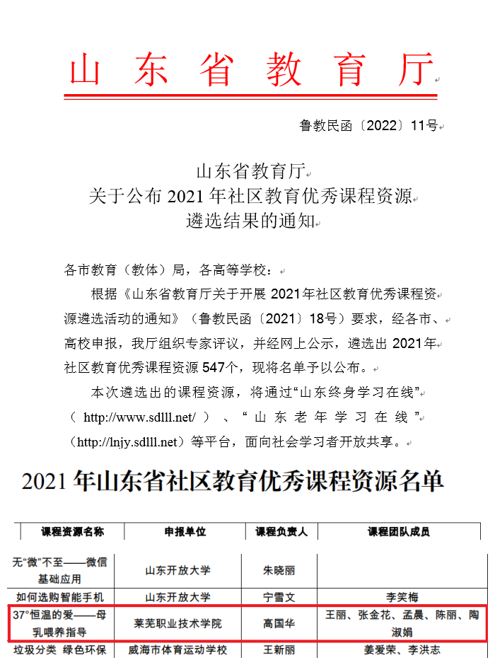 近日,山东省教育厅公布了2021年社区教育优秀课程资源遴选结果,学院高国华、王丽、张金花、孟晨、陈丽、陶淑娟等老师合作完成的课程《37°恒温的爱——母乳喂养指导》成功入选。