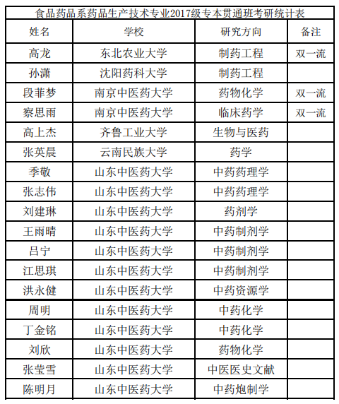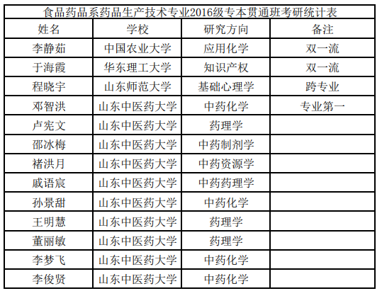 日前,学院食品药品系药品生产技术专业考研传来捷报。在考研形势日趋激烈和疫情的双重影响下,药品生产技术专业2017级专本贯通班37名同学中,有18名同学顺利考取研究生,占比48.6%,较2016级同比增加12.2%。其中,高龙、段梦菲、察思雨同学分别考取双一流高校东北农业大学、南京中医药大学的研究生,孙潇、高上杰、季敬等同学分别考取沈阳医科大学、齐鲁工业大学、山东中医药大学等省内外知名大学的研究生。