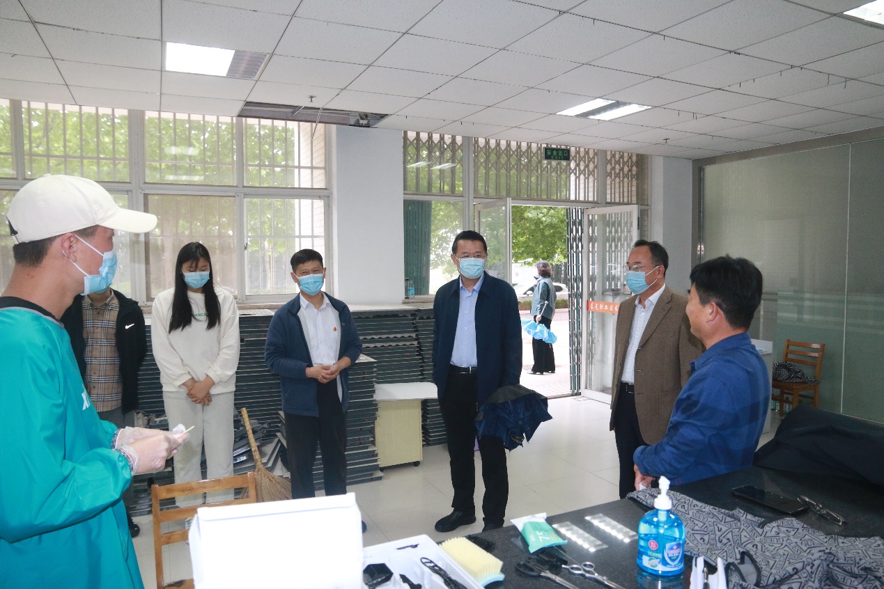 5月9日下午,党委副书记、院长孔祥敏,党委副书记毕玉海在党委组织部(党委统战部)、党委学生工作部负责人陪同下到志愿理发现场。孔祥敏对参加志愿服务的师生表示感谢,对大家利用一技之长为师生服务,为疫情防控奉献的精神表示赞赏。