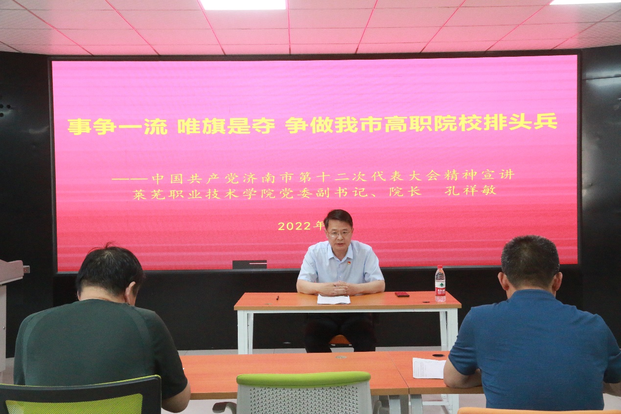 孔祥敏强调,报告在描绘我市未来产业发展壮阔图景的同时也明确提出,要加快职业教育创新发展高地建设。这为职业教育高质量发展提供了广阔舞台,为人才培养指明了方向路径,极大鼓舞了我们抓住机遇、乘势而上、直面挑战、克难奋进的决心和信心。学院将认真贯彻落实市第十二次党代会精神,积极打造技术技能人才培养高地、产教融合高地、应用技术研发高地、社会服务高地,为济南市强省会建设贡献莱职担当。