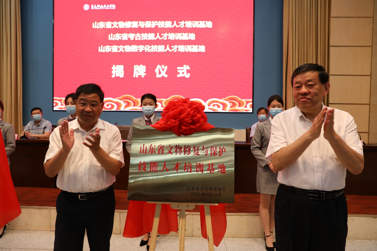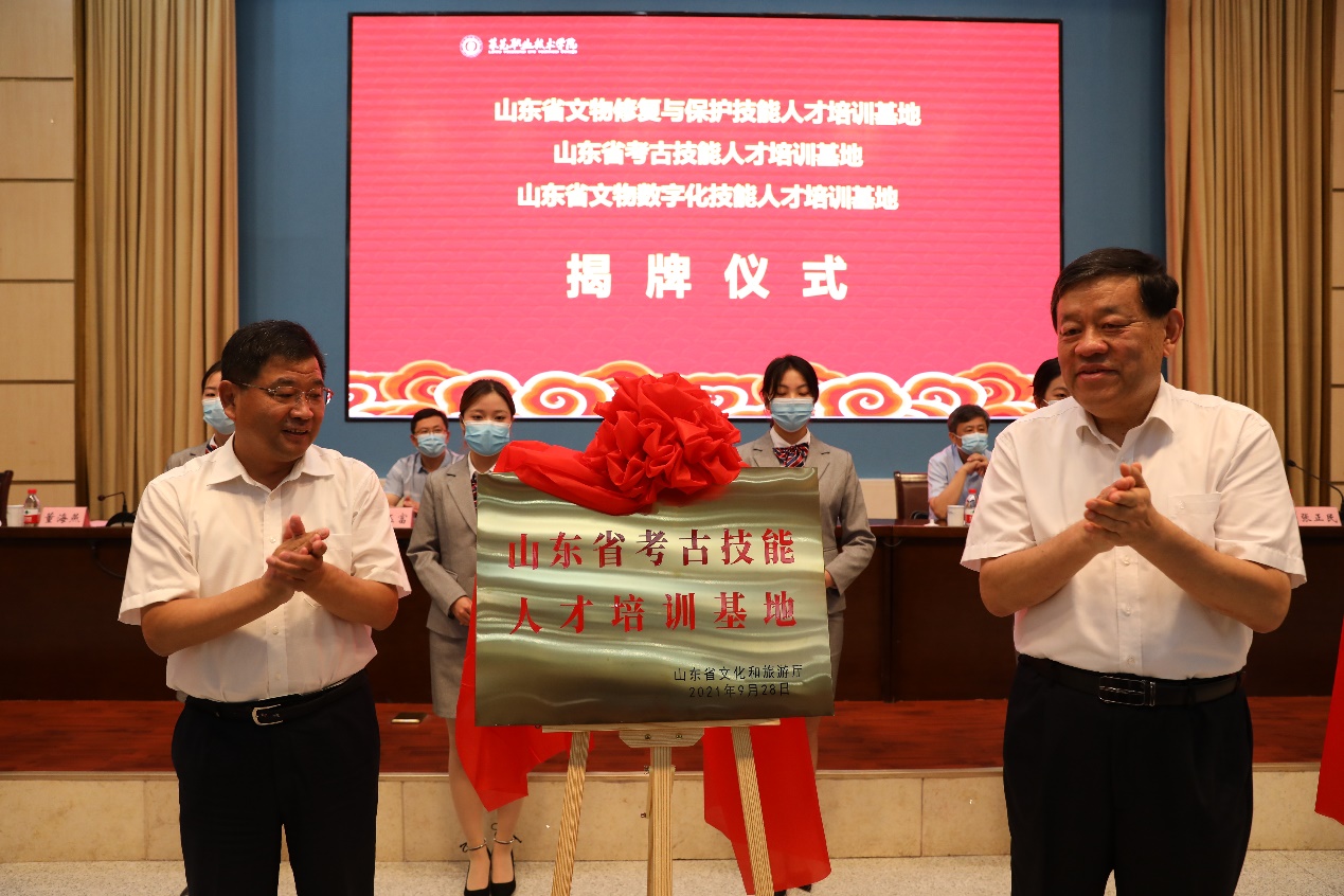 王廷琦与董海燕共同为山东省文物保护技能人才培训基地、山东省考古技能人才培训基地、山东省文物数字化技能人才培训基地揭牌。