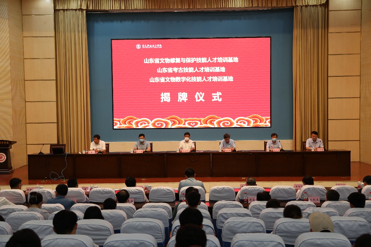 6月10日下午,山东省文物保护技能人才培训基地、山东省考古技能人才培训基地、山东省文物数字化技能人才培训基地揭牌仪式在学校举行。省文化和旅游厅党组成员、副厅长、省文物局副局长王廷琦,省教育厅职业教育处二级调研员吕序峰,省文化和旅游厅文物保护与考古处处长兰玉富,山东博物馆党委书记、馆长郑同修,省文物考古研究院院长孙波,省文物保护修复中心主任王传昌,省水下考古研究中心主任刘延常,市文化和旅游局党组成员、正处级领导干部张正民,市考古研究院院长李铭,市考古研究院副院长郭俊峰,莱芜区文化和旅游局局长王际海,莱芜区古嬴文物考古研究所所长郗重阳以及学校领导班子成员出席仪式,相关处室、系负责人参加仪式。仪式由党委副书记、院长孔祥敏主持。