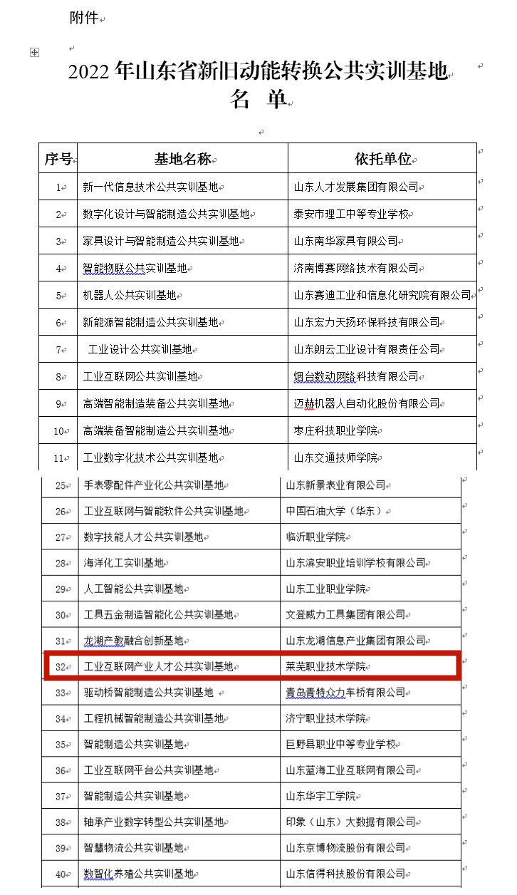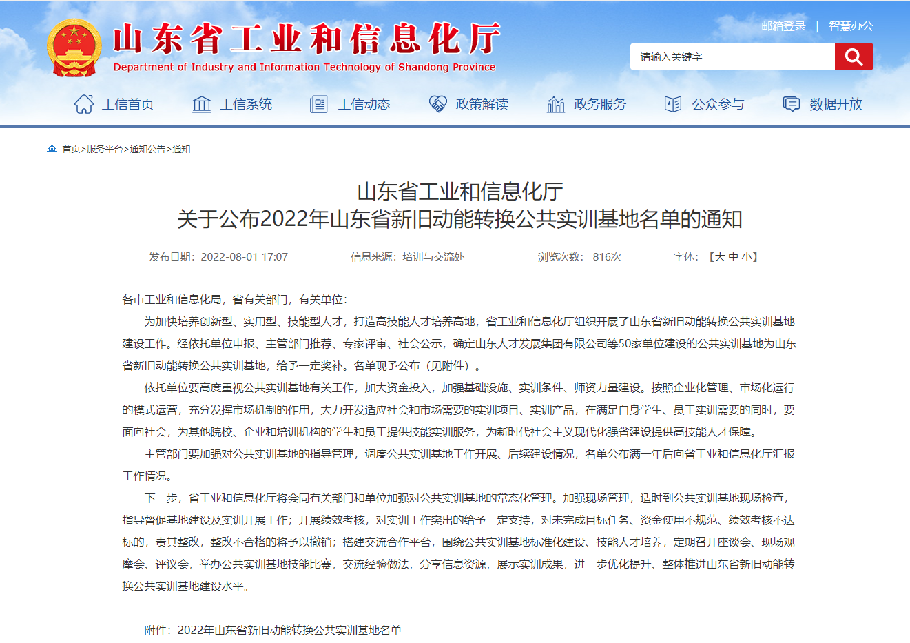 经学校申报、主管部门推荐、专家评审、社会公示,7月29日,学校工业互联网产业人才公共实训基地被省工业和信息化厅确定为山东省新旧动能转换公共实训基地。