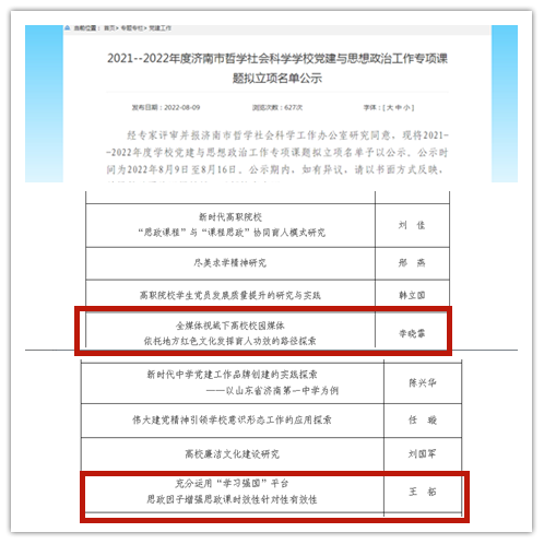近日,市委教育工委对2021—2022年度济南市哲学社会科学学校党建与思想政治工作专项课题拟立项名单进行公示,学校提报的《全媒体视域下高校校园媒体依托地方红色文化发挥育人功效的路径探索》《充分运用“学习强国”平台思政因子增强思政课时效性针对性有效性》榜上有名。其中,《全媒体视域下高校校园媒体依托地方红色文化发挥育人功效的路径探索》重点探索融媒体时代,高校校园媒体如何与地方红色文化实现高度联动,从而不断增强高校校园媒体的育人实效;《充分运用“学习强国”平台思政因子增强思政课时效性针对性有效性》重点研究如何充分利用“学习强国”平台,增强思政育人的时效性、针对性和有效性。