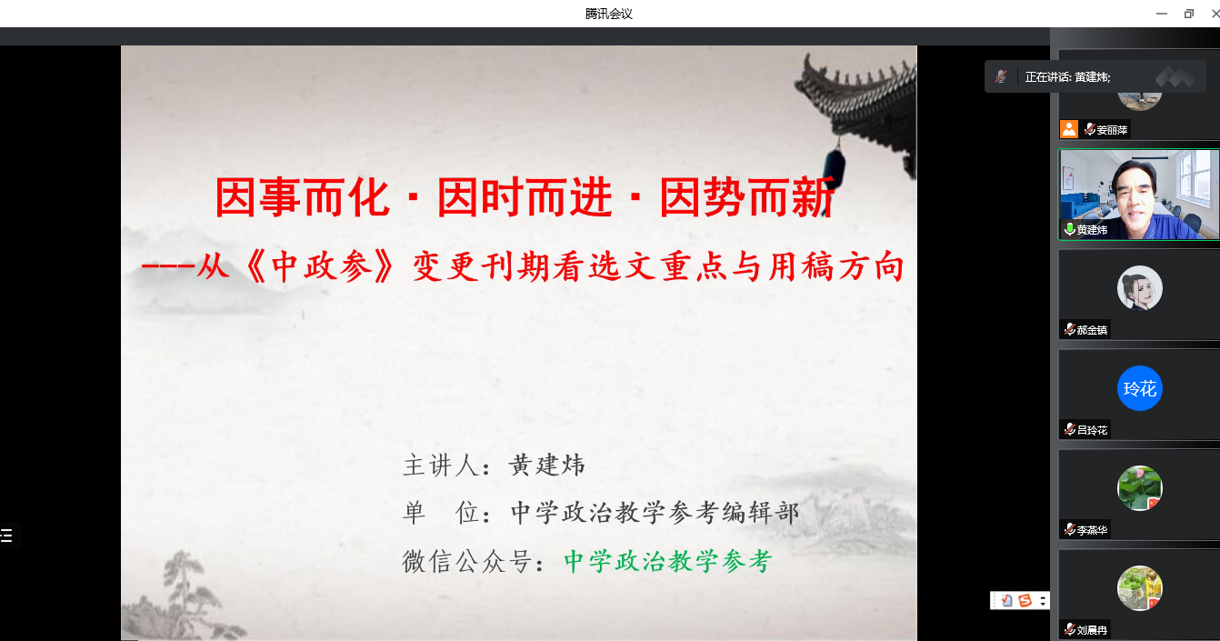 9月3日下午,《中学政治教学参考》主编黄建炜应邀作线上专题报告,全体思政课教师认真聆听了报告。近年来,在黄建炜等期刊人的努力下,《中学政治教学参考》从月刊到旬刊再到周刊,从中学到大学、从教学到理论,已经成为在全国最有影响力的政治期刊、中文核心期刊,成为广大思政课教师的良师益友。