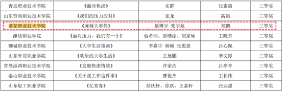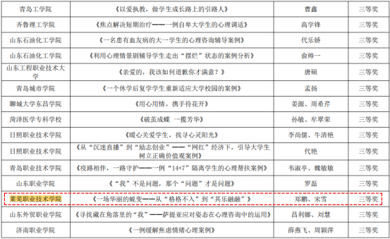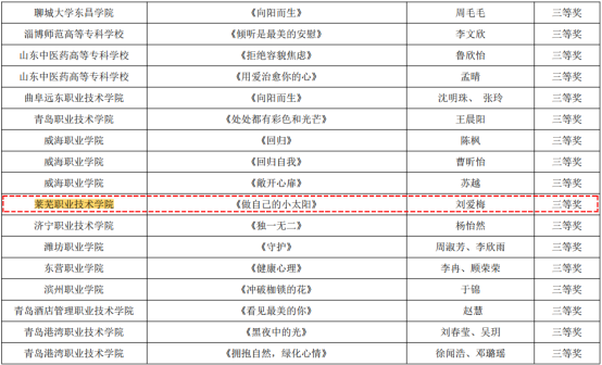 近日,山东省大学生心理健康教育专业委员会公布了2022年山东省高校心理健康教育月展示活动结果,学校提交的4件作品中有3项喜获奖项。其中,郑鹏、宋雪老师的心理辅导案例《一场华丽的蜕变——从“格格不入”到“其乐融融”》荣获“携手同行”优秀心理辅导案例三等奖;郑鹏老师指导的脱口秀《麻辣大事件》荣获“妙语绘心”心理健康主题脱口秀三等奖;师范教育与艺术系学生刘爱梅的海报作品《做自己的小太阳》荣获“画解心情”心理健康主题宣传海报三等奖。