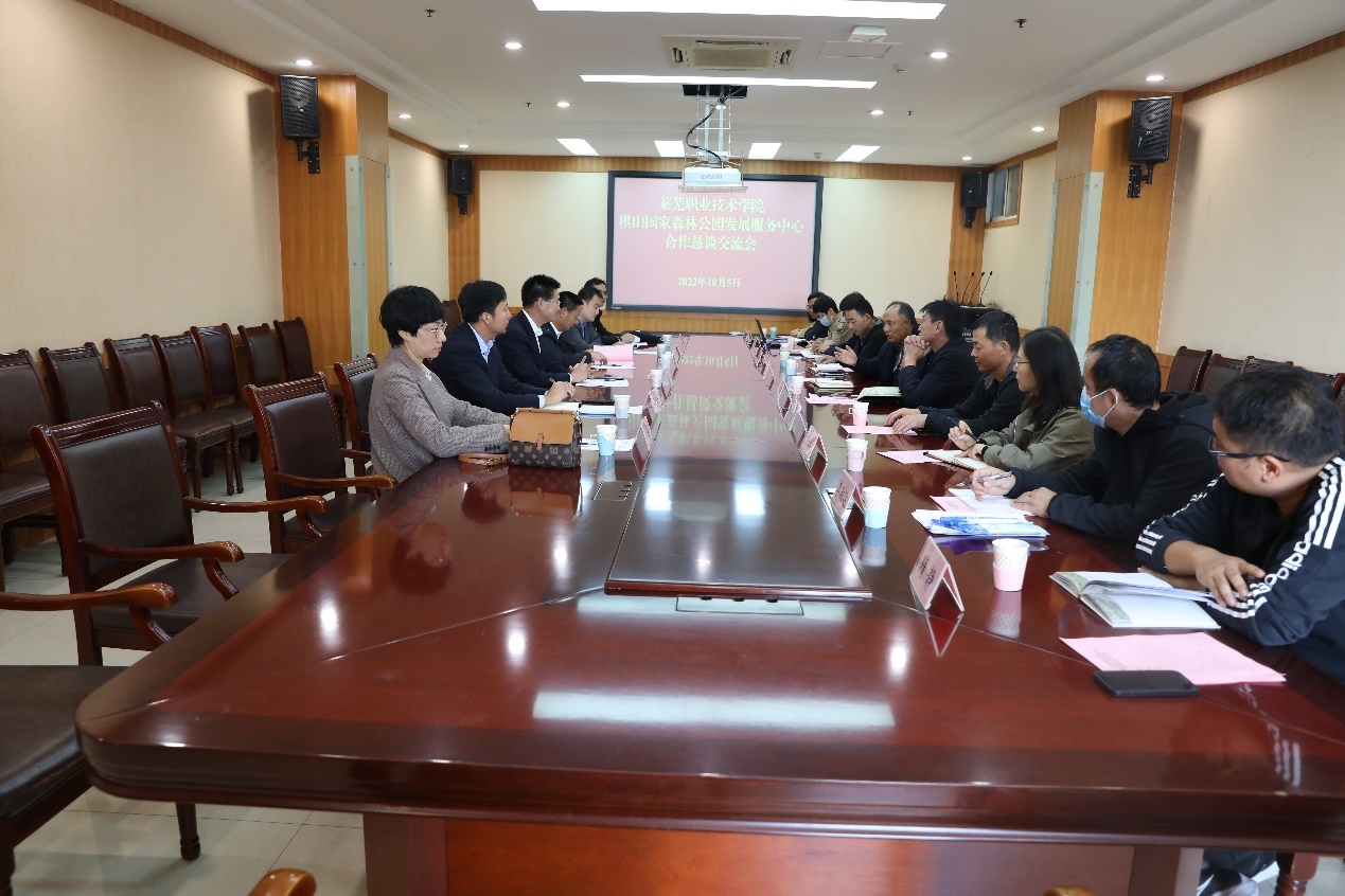 10月5日上午,棋山国家森林公园发展服务中心党委书记张学波、党委委员陈杰、李文科、李海波等一行7人来学校洽谈棋山国家森林公园田园综合体项目投资建设工作。副院长魏广舜出席座谈会,职业能力训练中心负责人及工作人员,各相关专业的专家教授参加座谈会。