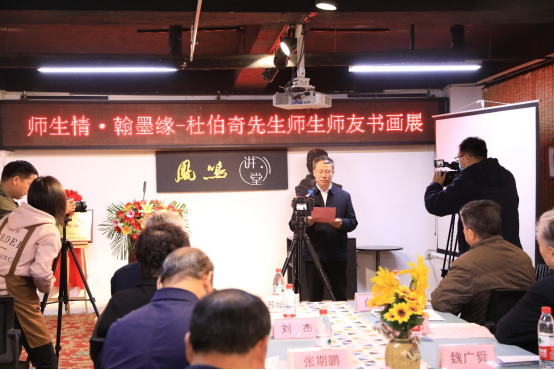 11月6日上午,杜伯奇先生师生师友书画展在三味书屋凤鸣讲堂开幕。原莱芜市政协副主席苏灿华讲话并宣布书画展开幕,济南市莱芜区文联党组书记、主席卢亮书,杜伯奇先生亲属、好友及学生代表,贺展书画家等参加开幕式,副院长魏广舜参加开幕式并讲话。活动由垂杨书院副院长孟兆印主持。