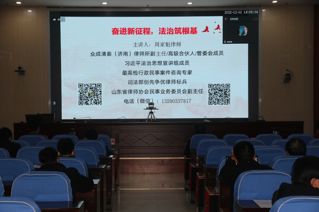 为更好推进习近平法治思想进头脑,筑牢广大青年成长成才的法治思想基础,引导青年积极投身新时代全面依法治国实践,在建设法治中国的宏伟征程中贡献青春力量,12月1日下午,习近平法治思想“济南律师宣讲团”宣讲培训会在学校举行。党委书记孔祥敏,纪委书记、监察专员付萍,副院长李允实,副院长邹翠兰,学校副科以上干部,各系法治工作联络员参加培训。本次培训采用腾讯视频会议形式开展,邀请习近平法治思想宣讲组成员、众成清泰(济南)律师所副主任周家魁以“奋进新征程 法治筑根基”为主旨作专题培训。