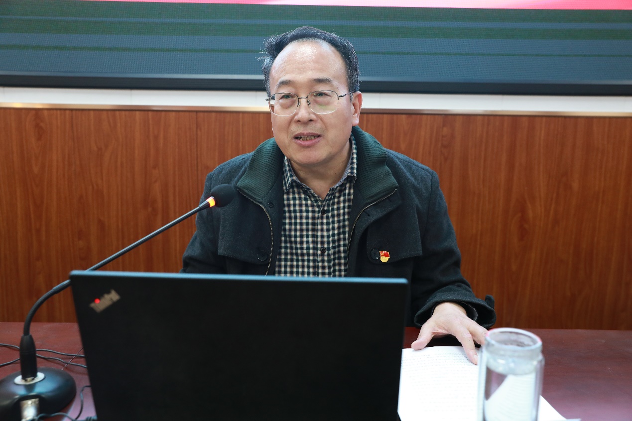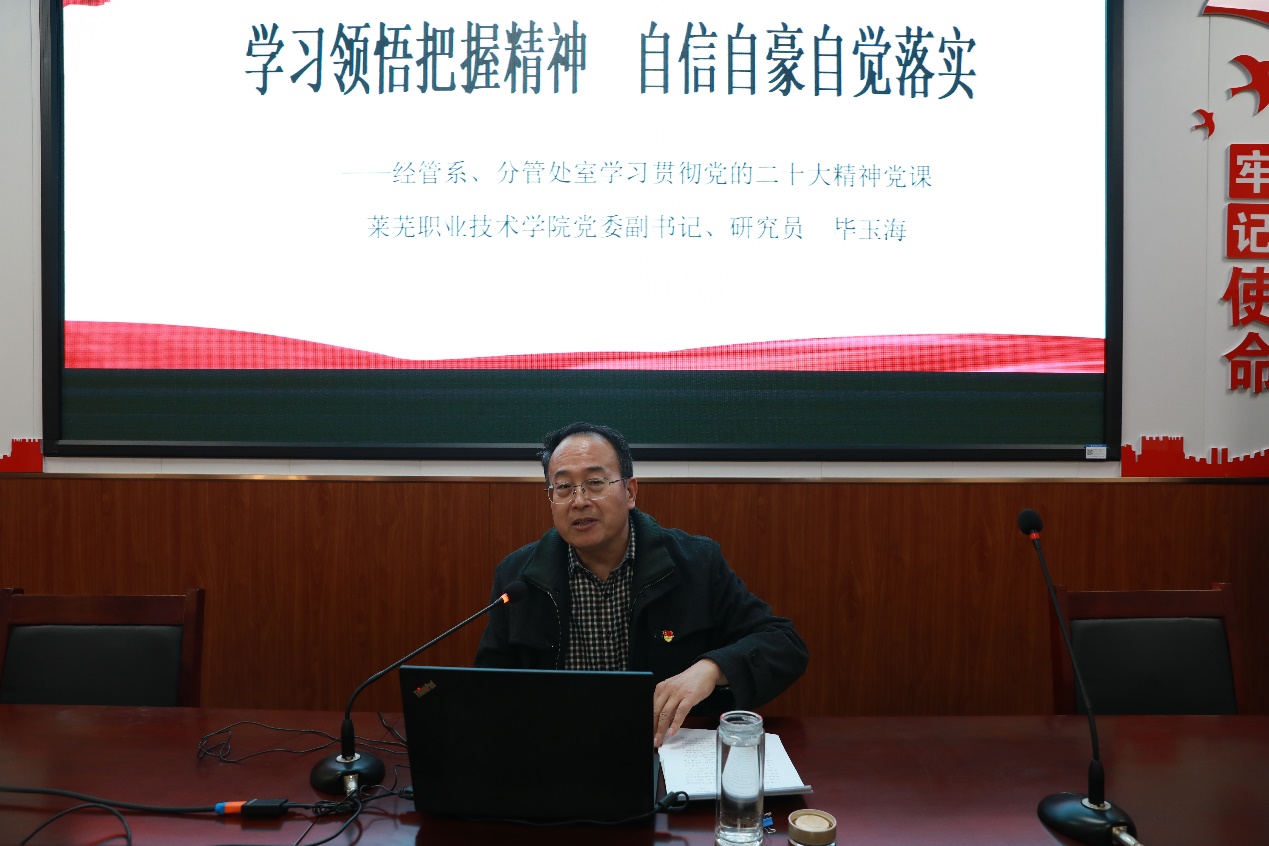 12月14日下午,党委副书记毕玉海以“学习领悟把握精神,自信自豪自觉落实——党的二十大精神党课”为题讲授学习宣传贯彻党的二十大精神专题党课,经济管理系及分管处室在校党员现场聆听,居家办公党员通过腾讯会议聆听专题党课。