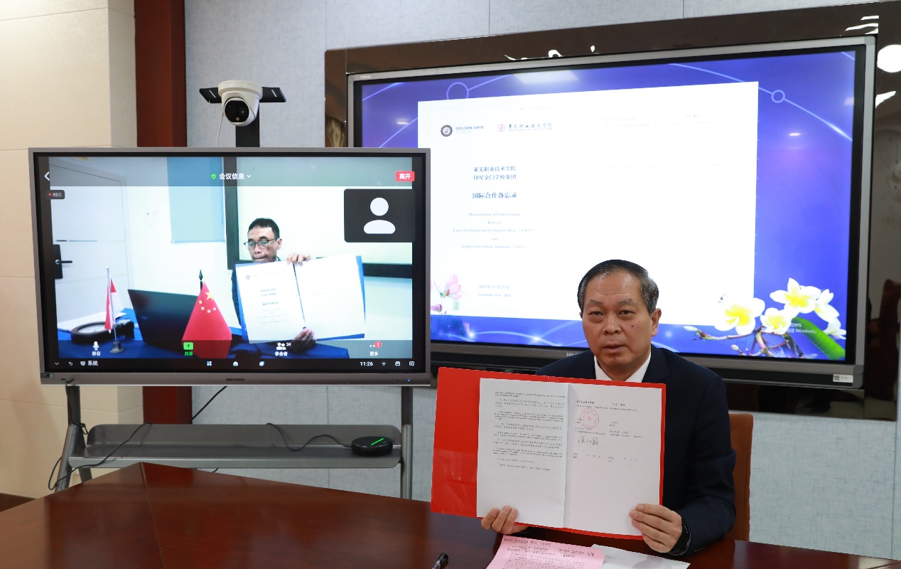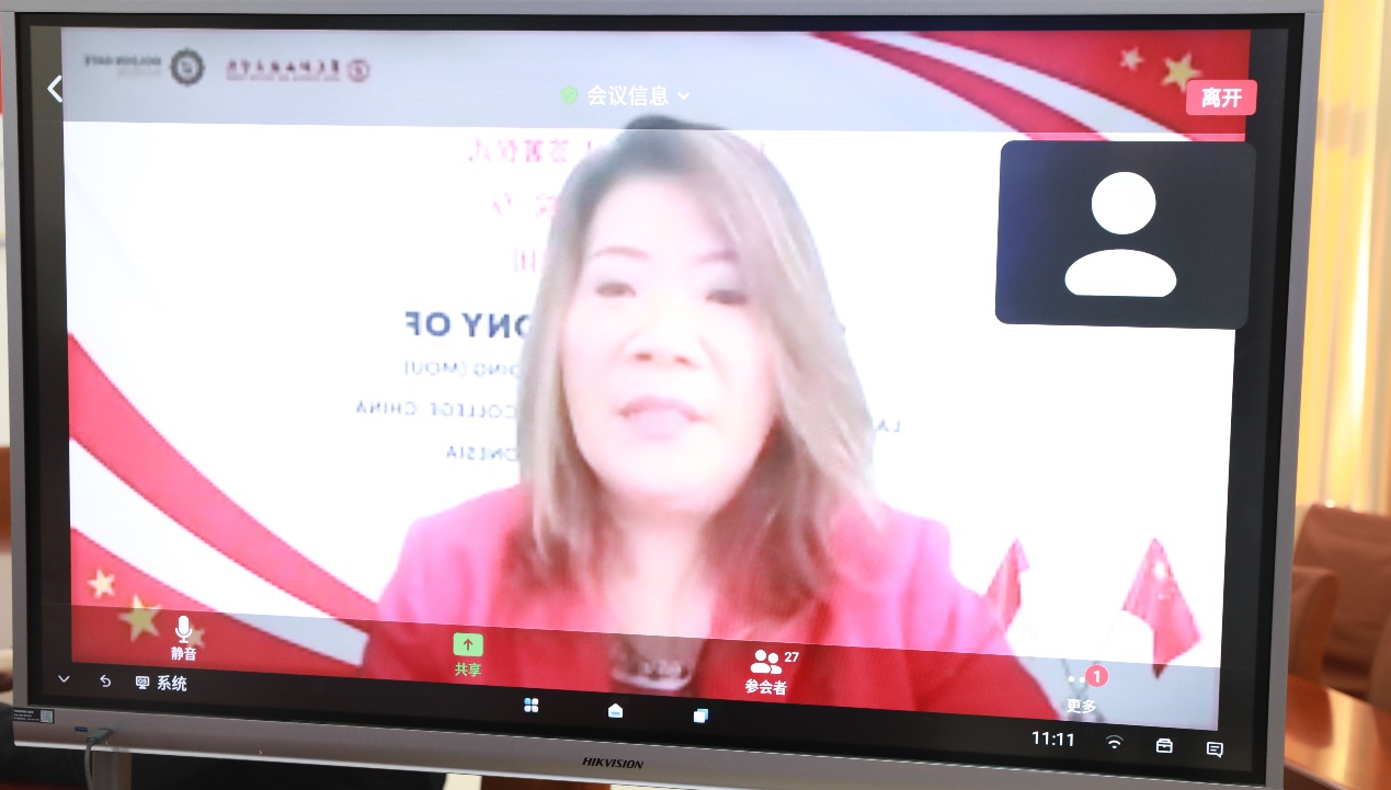 1月9日上午,学校举行与印尼金门学校国际合作备忘录签约仪式。印尼西巴布亚省地方发展局局长拉赫曼,印尼共和国众议院议员、斯瓦迪里研究所所长、前印尼巴布亚省人力资源部部长扎哈里亚斯 · 吉伊,印尼金门教育基金会(集团)主席莉莉 · 库苏拉 · 钱德拉,印尼教育发展集团顾问、马来西亚国家消费人行动议会议员张峰瑞,印尼金门学校校长尤斯兰 · 巴克里,济南市教育局总督学林钟,济南市教育局职业与高等教育处处长李干三,济南市教育局国际交流与合作处处长任树军,学校党委副书记、院长徐运国,副院长邹翠兰,学校国际交流合作处负责人参加签约仪式。本次签约采用线上形式举行,仪式由邹翠兰主持。