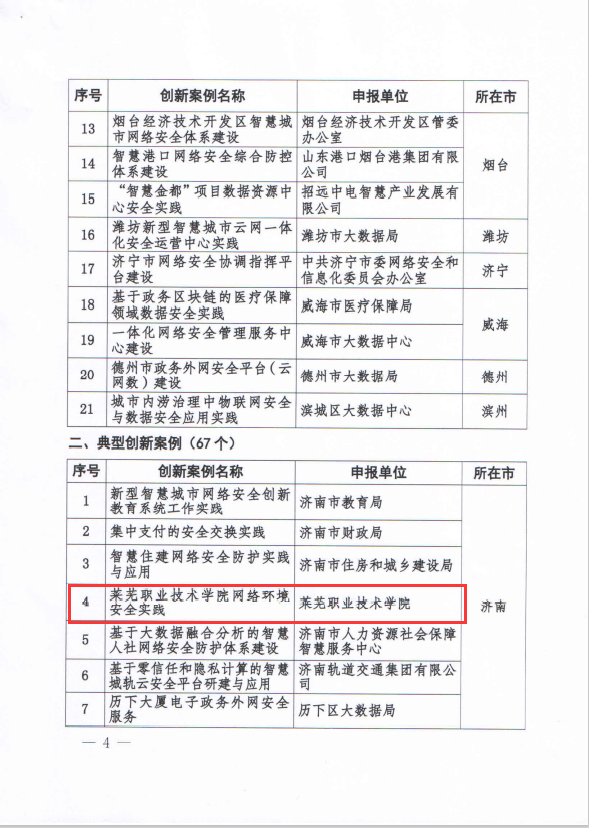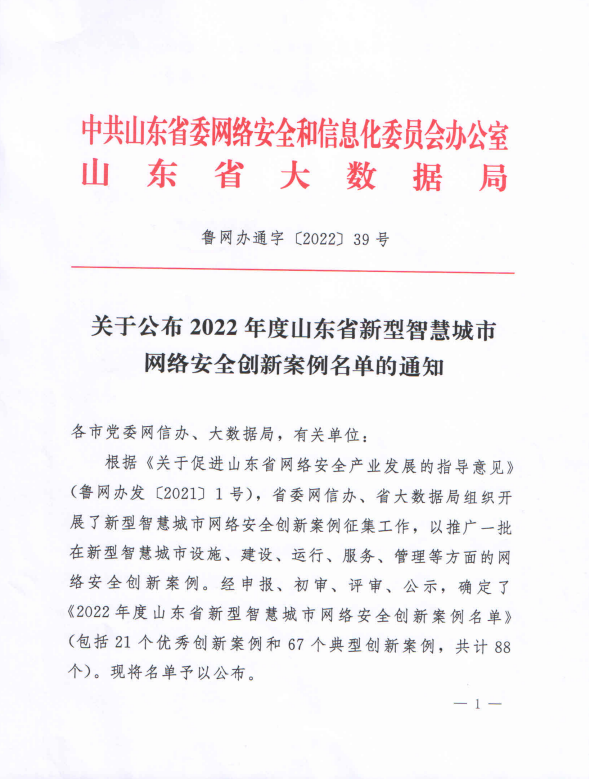 近日,中共山东省委网络安全与信息化委员会办公室、山东省大数据局发布《关于公布2022年度山东省新型智慧城市网络安全创新案例名单的通知》,学校上报的《beat365在线唯一官网网络环境安全实践》案例获评典型创新案例。