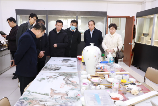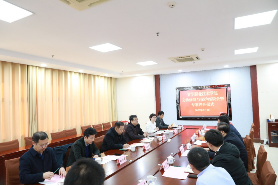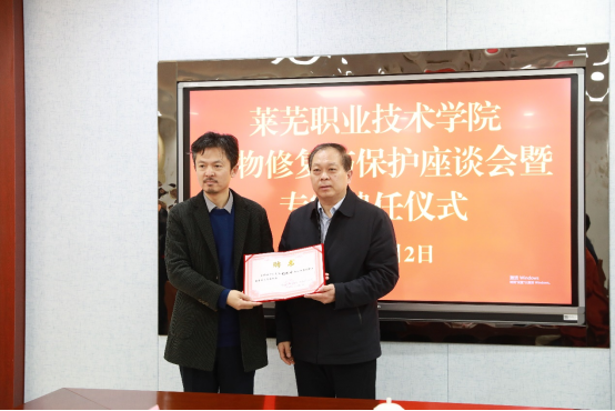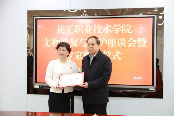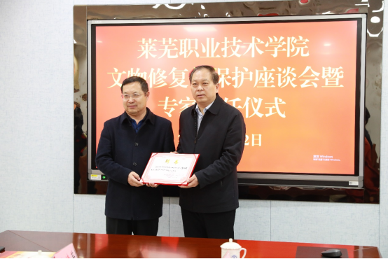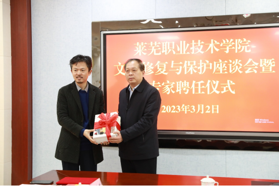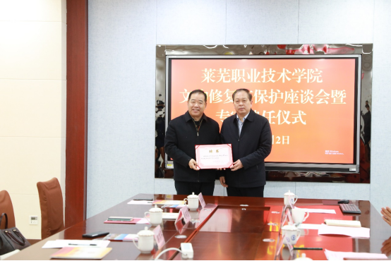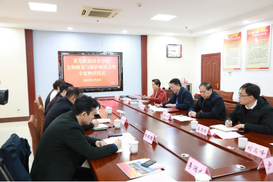 孔祥敏代表学校对专家的到来表示欢迎,并从专业设置、招生就业、人才培养、师资队伍等方面介绍了学校基本情况。他指出,文物修复与保护专业是学校的特色专业。经过十几年发展,专业建设得到了行业和社会广泛认可,被评为国家骨干专业、山东省职业教育高水平专业群。牵头成立全国文物修复职业教育联盟,被国家《“十四五”文物保护和科技创新规划》列入文保人才培养培训的重要依托单位,纳入国家文物事业发展规划。近年来,学校坚持扎根齐鲁大地办教育,主动对接全国新旧动能转换综合试验区、中国(山东)自由贸易试验区、黄河流域生态保护和高质量发展三大国家战略,与济南产业发展同向同行、同频共振,在新时代中国特色社会主义现代化强省会建设进程中展现了莱职担当、贡献了莱职力量。