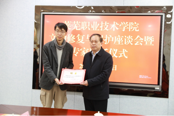 3月2日上午,学校举行文物修复与保护座谈会暨专家聘任仪式。北京市文物保护协会副会长兼秘书长许立华,清华大学环境学院研究员、副主任梁军平,清华大学美术学院研究员、副主任杨佩璋,有色金属工业人才中心主任助理、教育培训处处长赵丽霞,清华大学美术学院博士后马靖芸,山西省彩塑壁画保护研究中心主任李润成,学校党委书记孔祥敏,党委副书记、院长徐运国,副院长邹翠兰出席座谈会,学校相关处室、系负责人参加座谈会。