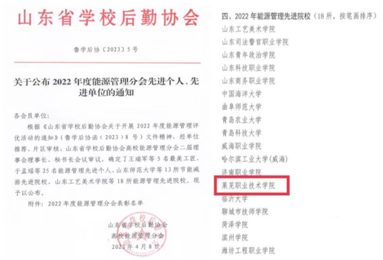 近日,山东省学校后勤协会发布《关于公布2022年度能源管理分会先进个人、先进单位的通知》,经申报、片区推荐、评审等程序,学校成功获评“2022年度能源管理先进院校”荣誉称号。