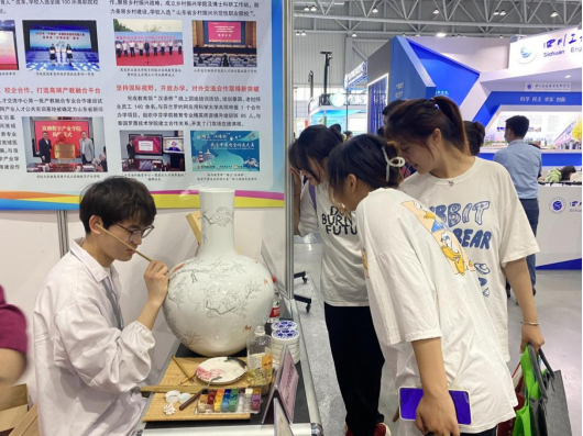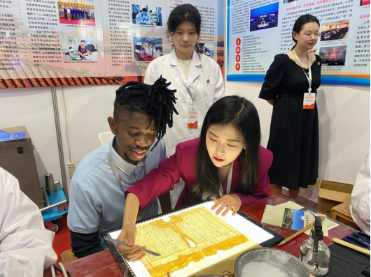 同学们的技能技艺展示吸引了现场观众的关注,来学校展区参观交流的观众络绎不绝,咨询文物保护的有关知识和专业建设情况。其中有参会师生,也有各高职院校和公司企业的领导,还有很多外国友人,大家都对文物修复与保护专业抱有非常浓厚的兴趣,纷纷表示文保专业是对中华优秀文化的传承,是非常有意义的专业。很多与会者看到同学们演示的修复技能后,都对文物修复产生了浓厚的兴趣,学校也给大家提供了不同门类的体验机会,可以亲身体验拓片制作、釉上彩绘和古籍修复的实践乐趣。