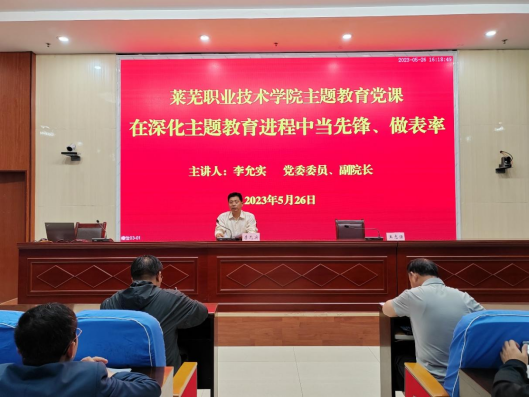 5月26日下午,根据学校学习贯彻习近平新时代中国特色社会主义思想主题教育工作安排,副院长李允实在办公楼214会议室以《在深化主题教育进程中当先锋、做表率》为题讲授专题党课。机关第三党支部、冶金与建筑工程系第二党支部、机械与汽车工程系第一党支部全体党员共计50余人聆听专题党课,党课由机关第三党支部书记、党委教师工作部(人事处)部长王志强主持。