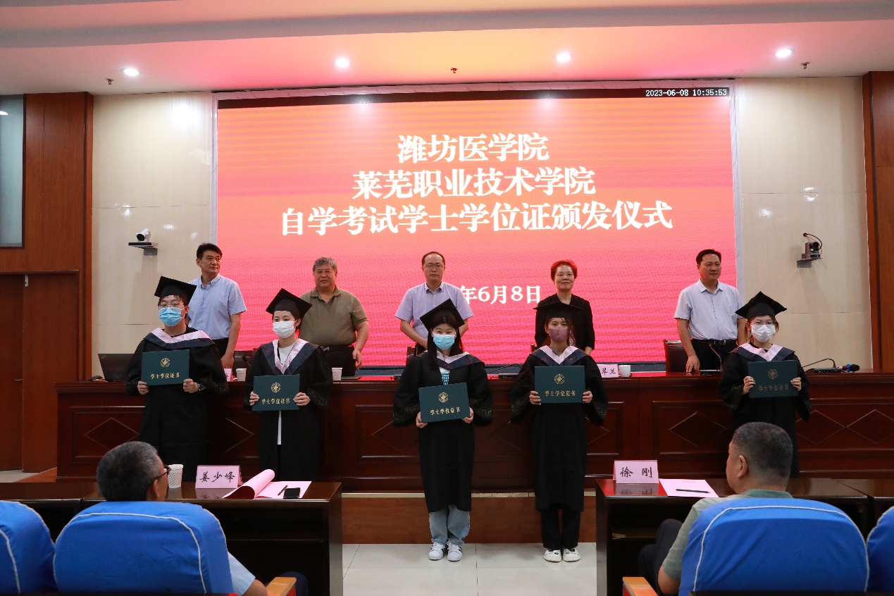 6月8日,学校与潍坊医学院联合举行自学考试本科学位证书颁发仪式。来自学校医学技术与护理系的39名学生,顺利完成潍坊医学院的自考本科学业。潍坊医学院虞河校区党委书记、继续教育学院院长李向辉,学校副院长邹翠兰出席证书颁发仪式,潍坊医学院继续教育学院、学校医学技术与护理系、职业能力训练中心相关负责人及15名毕业生代表参加颁发仪式。