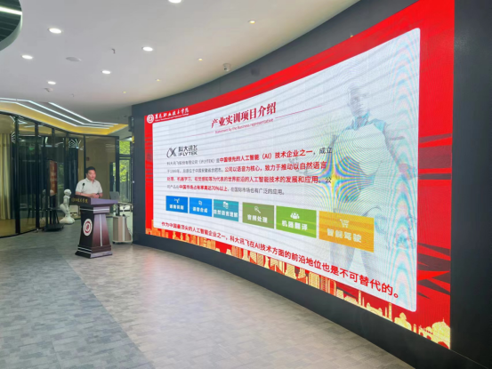 企业代表周荣介绍了即将开展的产业实训运营目标以及保障,重点强调本次产业实训追求“三真”,分别为“真场景、真订单、真企业化管理模式”;企业代表亓海玉也向同学们详细介绍了科大讯飞的企业情况及本次导入学校的产业实训项目;2022级计算机应用3班赵文豪同学作为学生代表进行了发言。