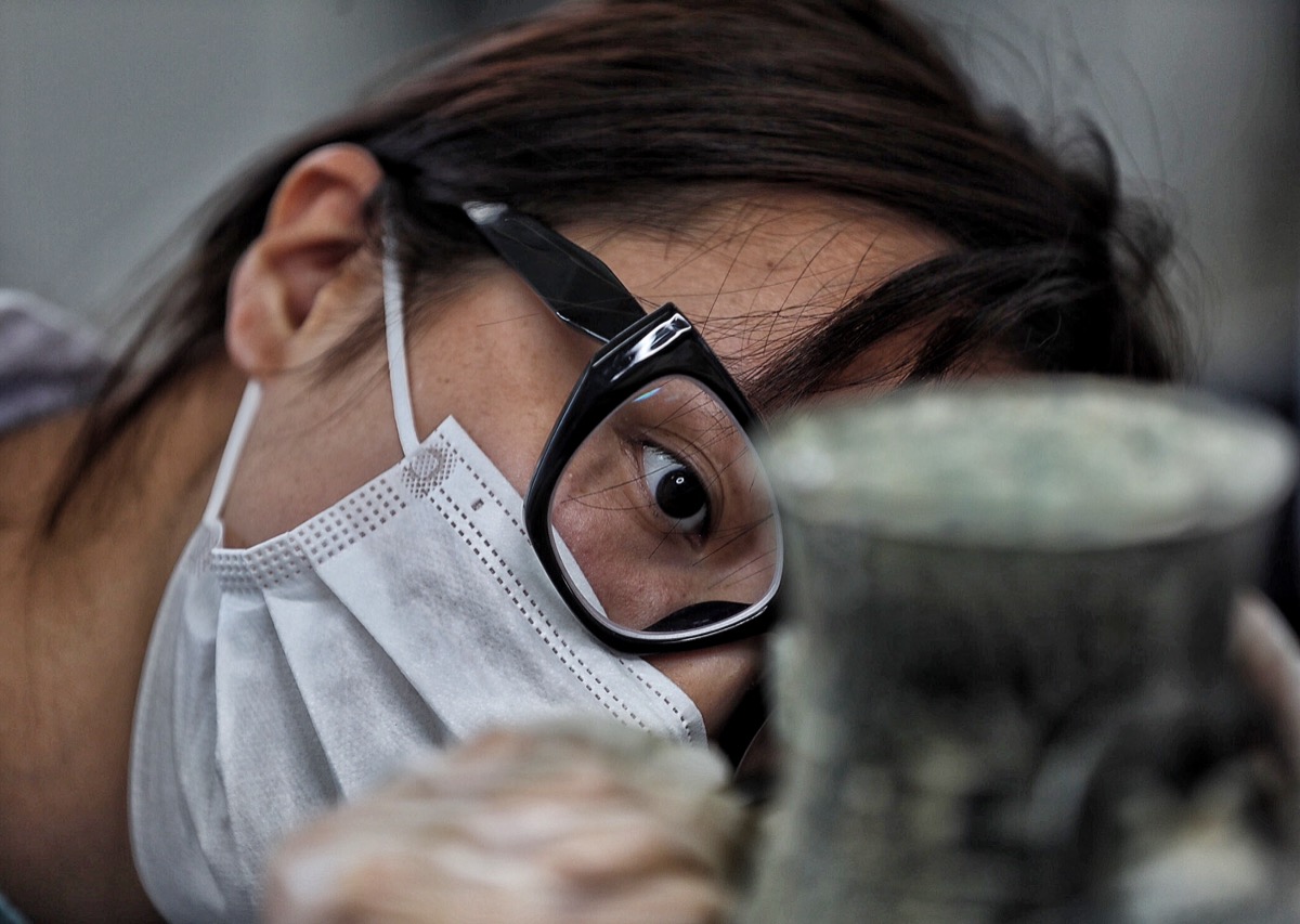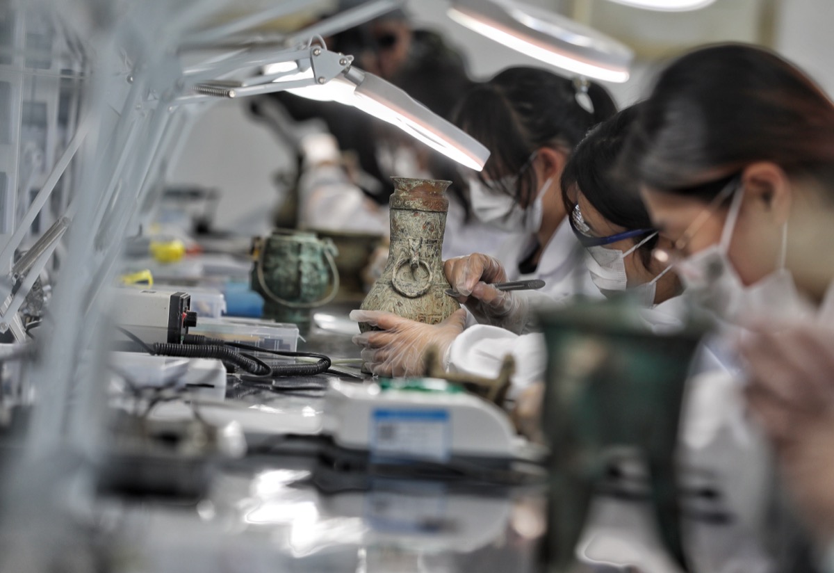 5月10日,山东beat365在线唯一官网文物修复与保护专业的学生正在对一件青铜器仿制品除锈。