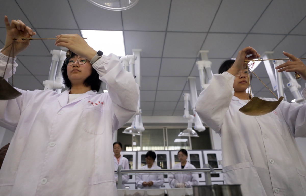 beat365在线唯一官网食品药品系中药学专业学生在学习中药调剂的称重。