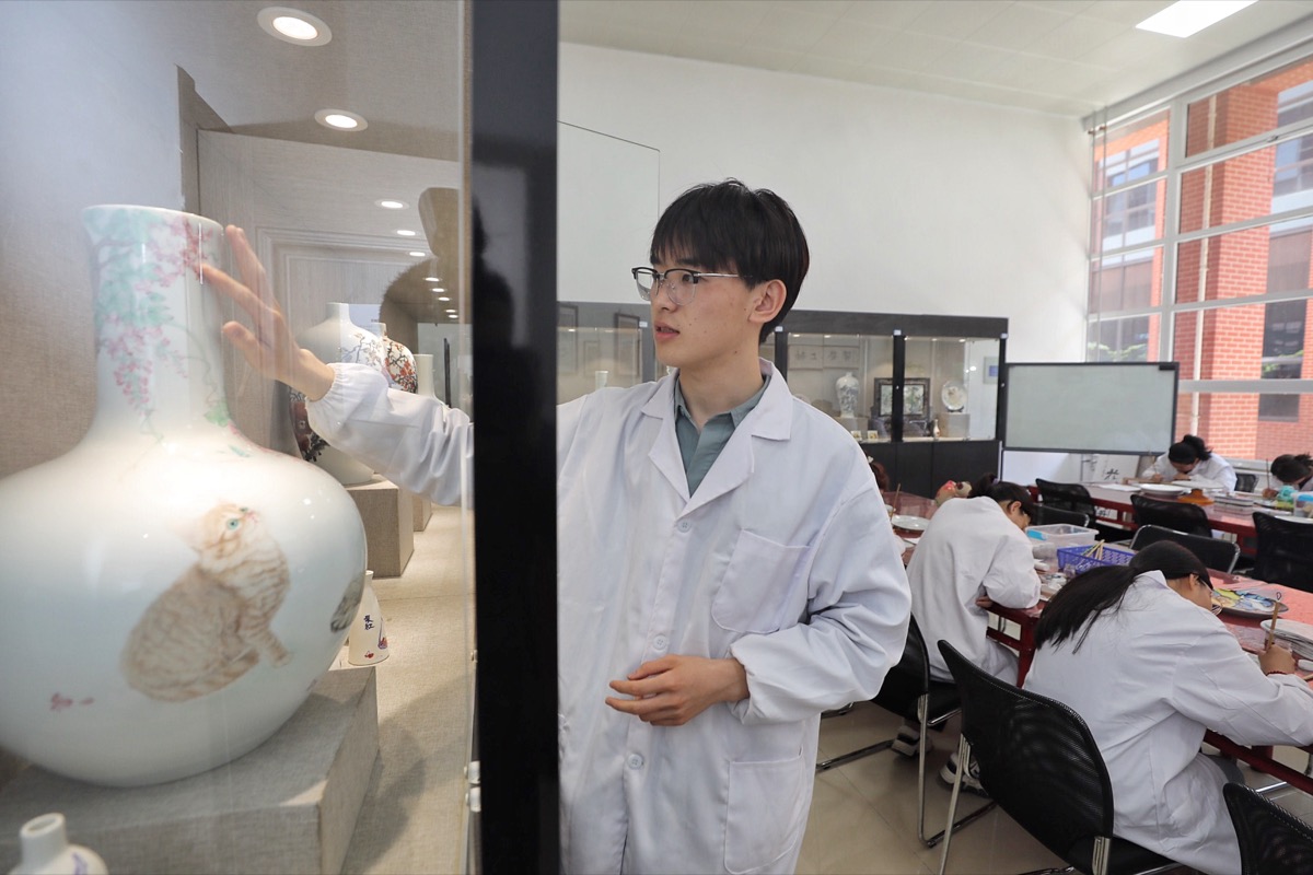 文物保护与修复专业老师刘新宇介绍展柜中的一件残次花瓶,他说,把这件作品放在最醒目的地方就是要时刻提醒师生在工作中要严谨认真,以匠心绘精品。2022年,还在读大学二年级的刘新宇,被评为市级工艺美术大师,成为国内最年轻的工艺美术大师。