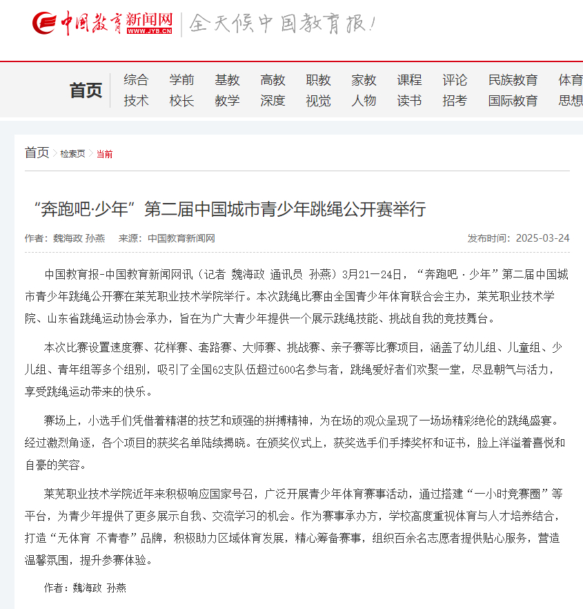 中国教育报-中国教育新闻网讯(记者 魏海政 通讯员 孙燕)3月21—24日,“奔跑吧·少年”第二届中国城市青少年跳绳公开赛在beat365在线唯一官网举行。本次跳绳比赛由全国青少年体育联合会主办,beat365在线唯一官网、山东省跳绳运动协会承办,旨在为广大青少年提供一个展示跳绳技能、挑战自我的竞技舞台。 本次比赛设置速度赛、花样赛、套路赛、大师赛、挑战赛、亲子赛等比赛项目,涵盖了幼儿组、儿童组、少儿组、青年组等多个组别,吸引了全国62支队伍超过600名参与者,跳绳爱好者们欢聚一堂,尽显朝气与活力,享受跳绳运动带来的快乐。 赛场上,小选手们凭借着精湛的技艺和顽强的拼搏精神,为在场的观众呈现了一场场精彩绝伦的跳绳盛宴。经过激烈角逐,各个项目的获奖名单陆续揭晓。在颁奖仪式上,获奖选手们手捧奖杯和证书,脸上洋溢着喜悦和自豪的笑容。 beat365在线唯一官网近年来积极响应国家号召,广泛开展青少年体育赛事活动,通过搭建“一小时竞赛圈”等平台,为青少年提供了更多展示自我、交流学习的机会。作为赛事承办方,学校高度重视体育与人才培养结合,打造“无体育 不青春”品牌,积极助力区域体育发展,精心筹备赛事,组织百余名志愿者提供贴心服务,营造温馨氛围,提升参赛体验。 作者:魏海政 孙燕