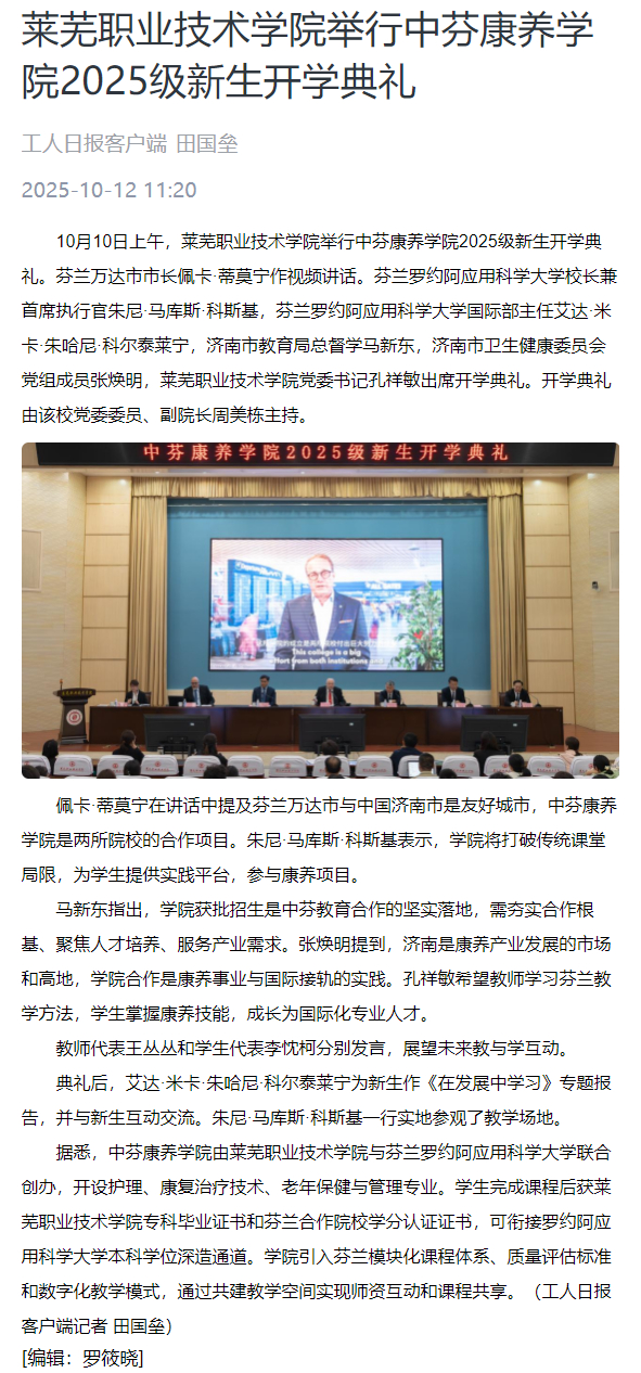 【工人日报】beat365在线唯一官网举行中芬康养学院2025级新生开学典礼