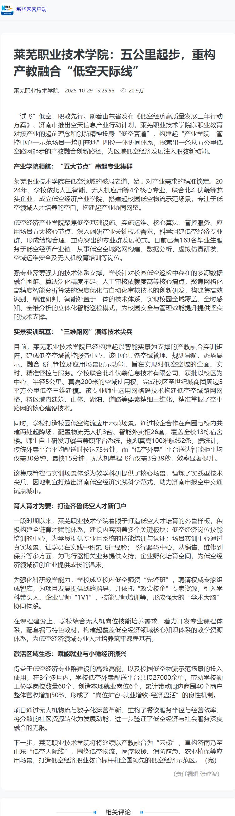 该集成管控与实训场景体系为教学科研提供了核心场景,锤炼了实战型技术尖兵,因地制宜打造出济南低空经济实践科学范式,助力济南申报空中交通试点城市。