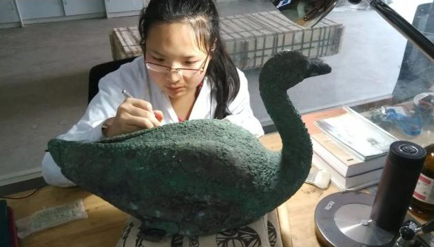 学校文物修复与保护专业毕业生李丹从事秦始皇陵7号陪葬坑青铜水禽修复工作