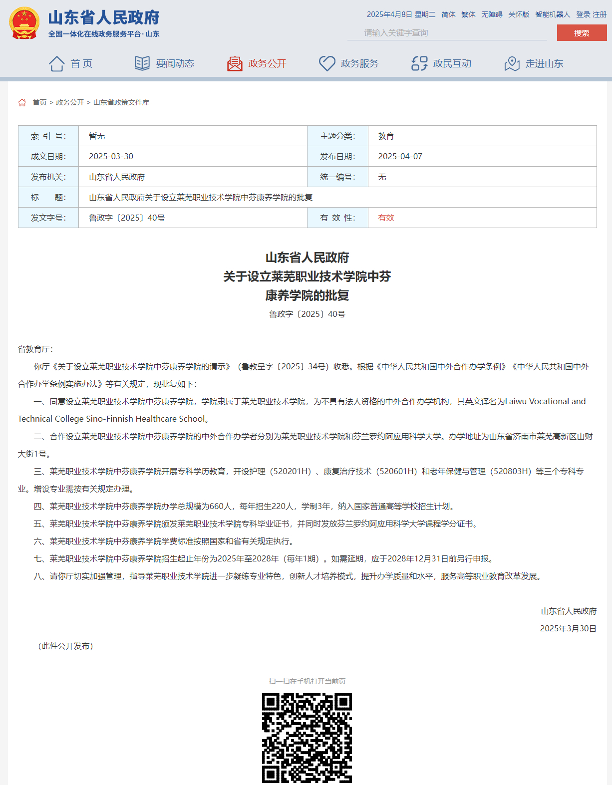 【山东省人民政府】山东省人民政府关于设立beat365在线唯一官网中芬康养学院的批复